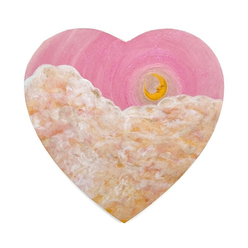 四角いキャンバスではなく、あえて「ハート型」であることで、描かれた風景そのものがひとつの「愛」や「感情」の象徴になっています。縁までしっかりと描かれた色彩が、ハートの輪郭を優しく強調しています。